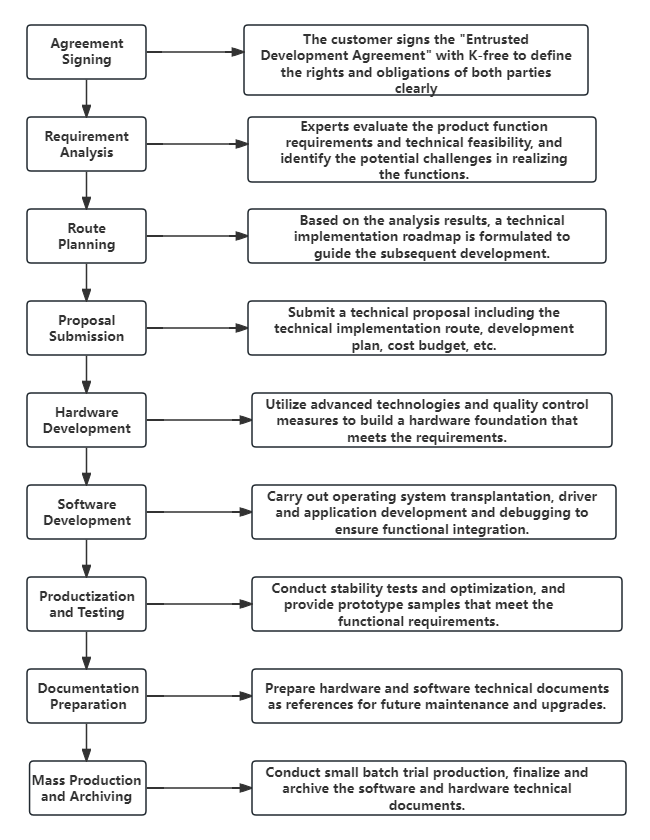 1. **Agreement Establishment**: Sign the "Entrusted Development Agreement". This step formalizes the collaboration between the customer and K-free, clearly defining the rights and obligations of both parties.